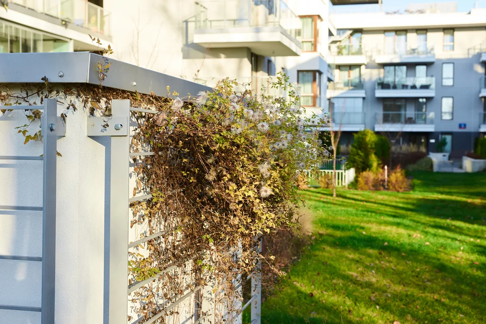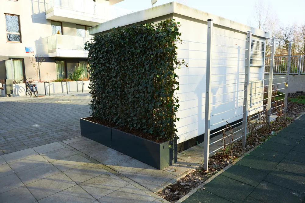 Przygotowaliśmy estetyczne donice, zamontowaliśmy stojaki rowerowe, a roślinność wprowadziliśmy również na ogrodzenia i wybrane fragmenty elewacji. Projekt wzbogacony został o nowoczesny plac zabaw, tworząc funkcjonalną i przyjazną użytkownikom przestrzeń zieloną.
