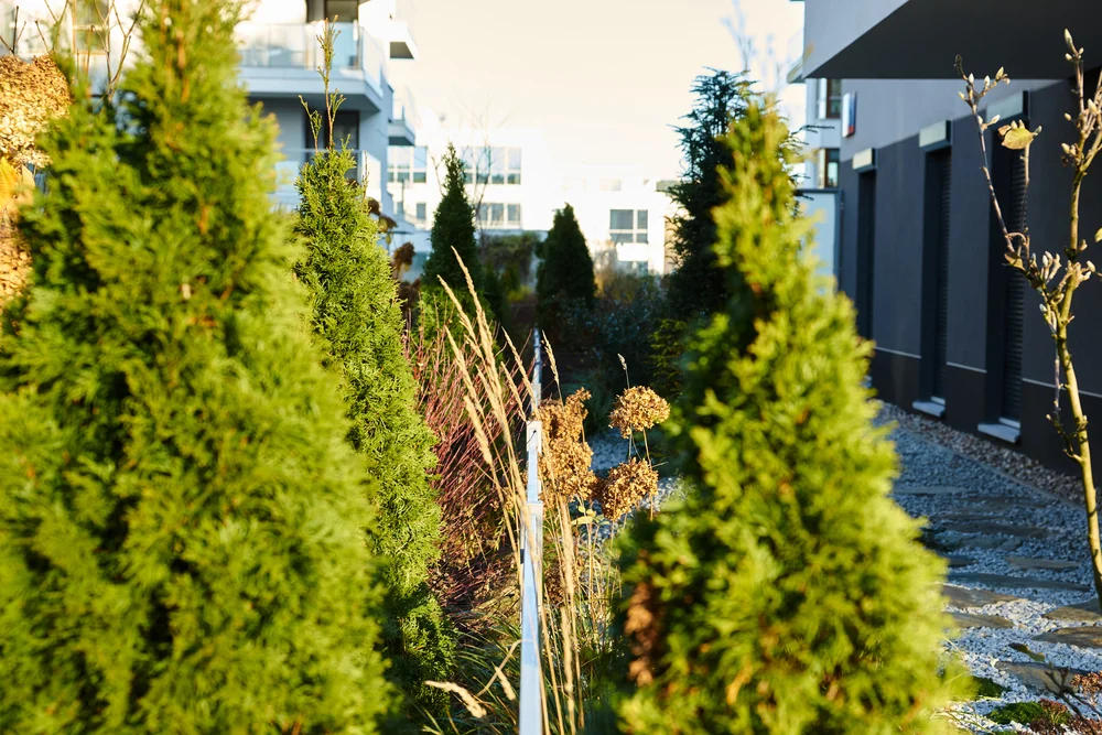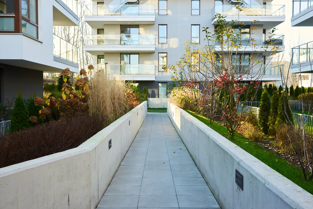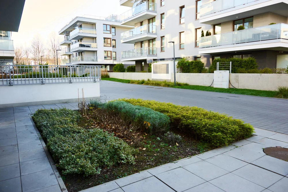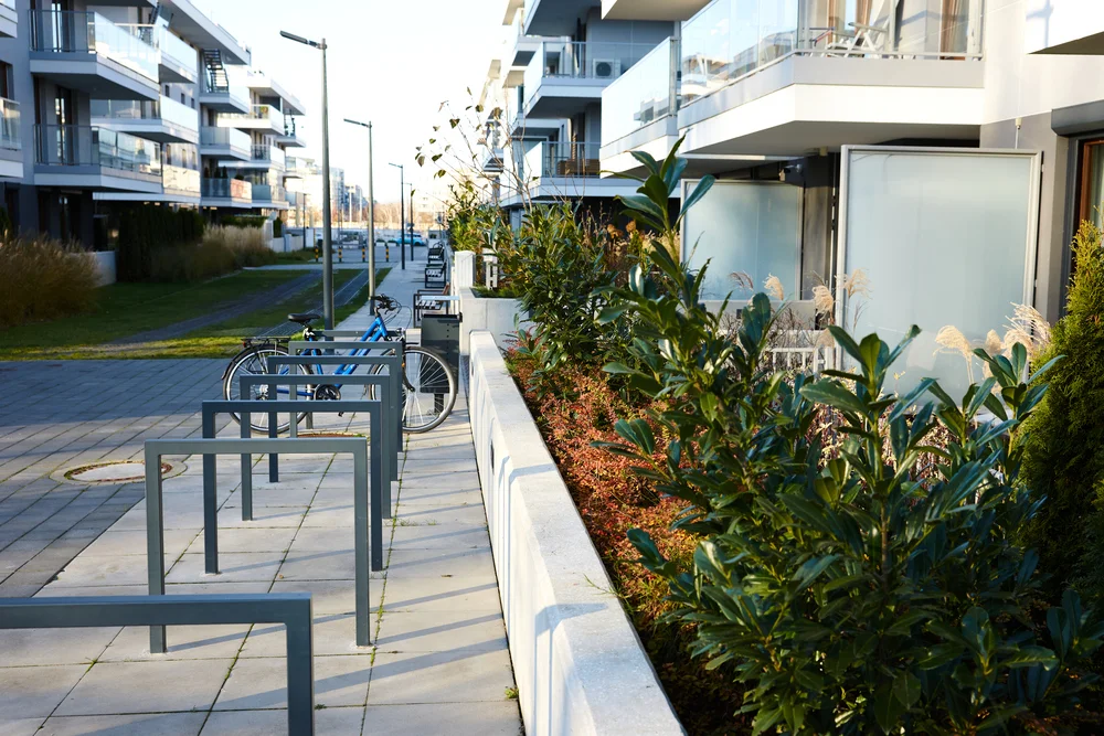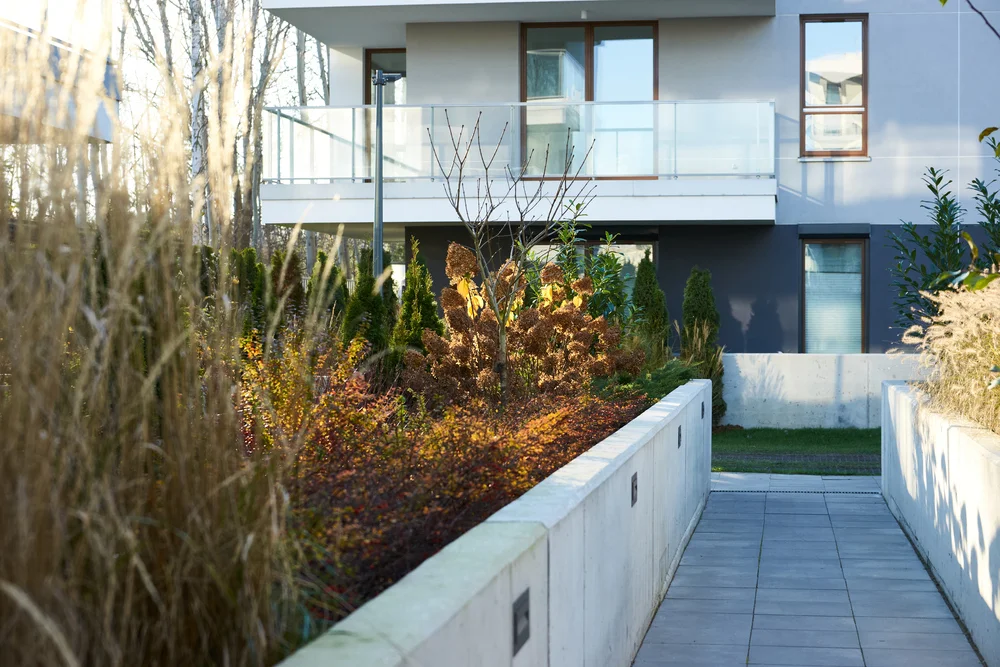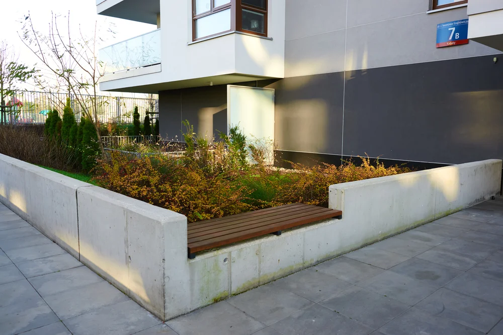 W inwestycji przy ul. Szajnowicza odpowiadaliśmy za pełne zagospodarowanie terenu, obejmujące wykonanie kostki brukowej, nasadzenia roślinne oraz małą architekturę.