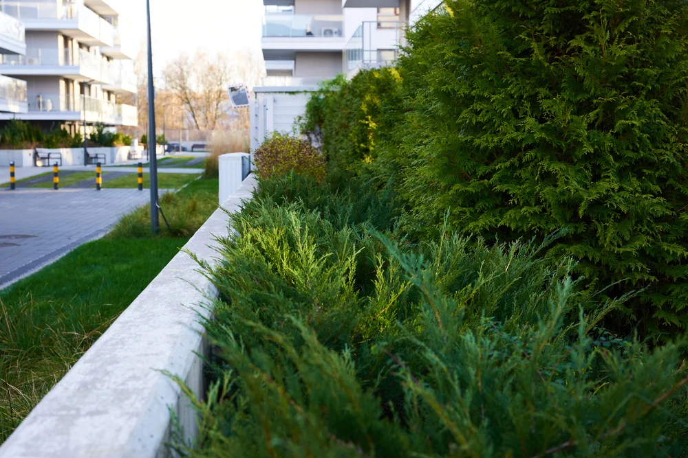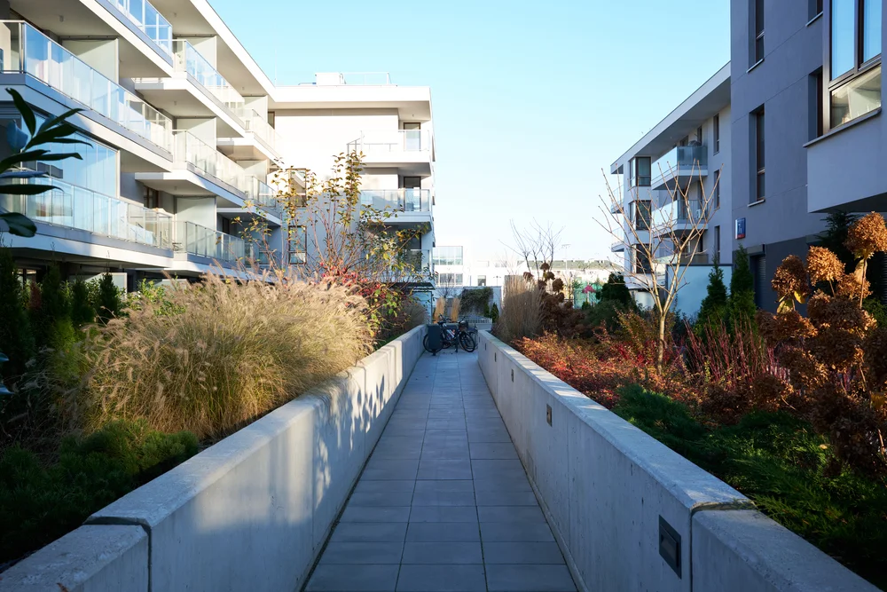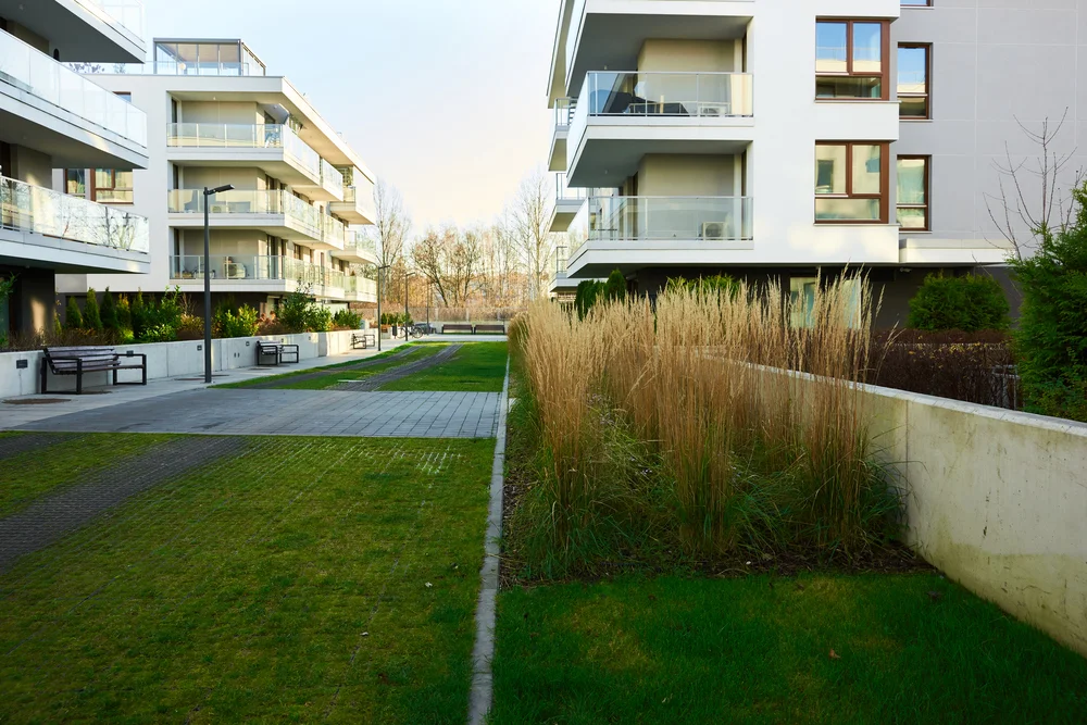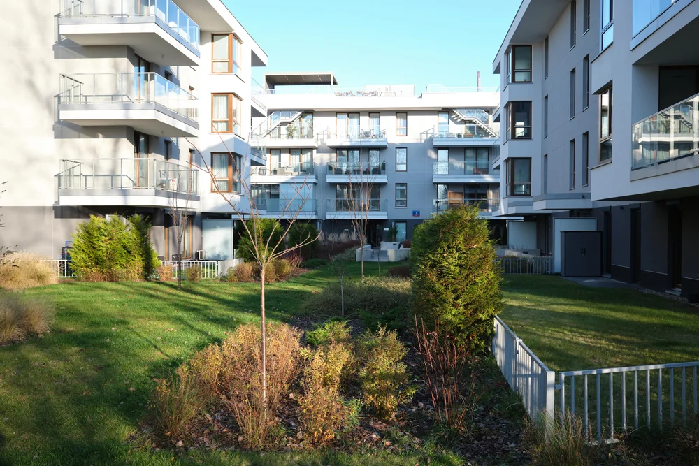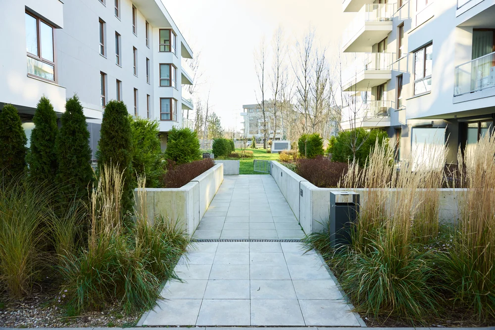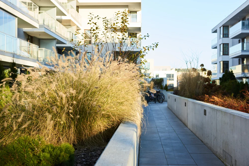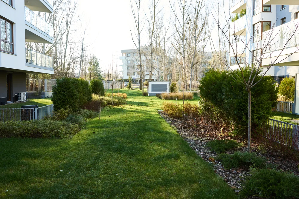 W inwestycji przy ul. Szajnowicza odpowiadaliśmy za pełne zagospodarowanie terenu, obejmujące wykonanie kostki brukowej, nasadzenia roślinne oraz małą architekturę.